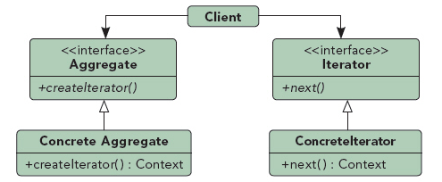 Iterator(抽象迭代器) ConcreteIterator(具体迭代器) Aggregate(抽象聚合类) ConcreteAggregate(具体聚合类)