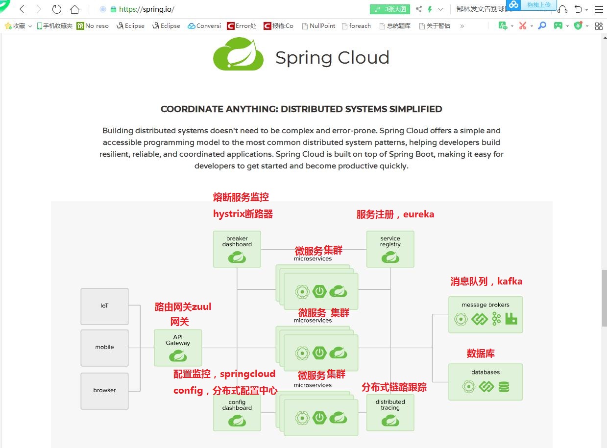 为各个微服务之间提供,配置管理、服务发现、断路器、 路由、微代理、事件总线、全局锁、决策竞选、分布式会话等等集成服务