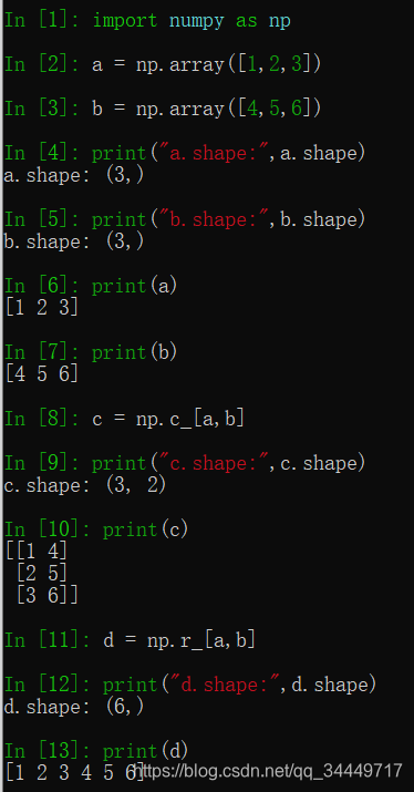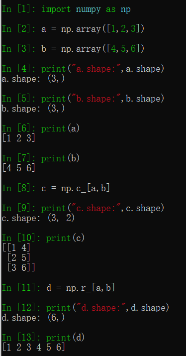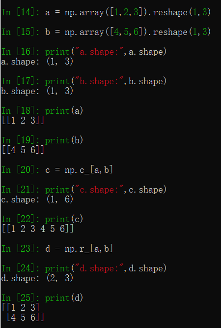 使用reshape修改a,b的形状后再次调用np.c_和np.r_效果如下: