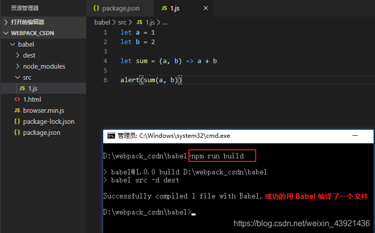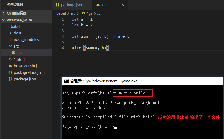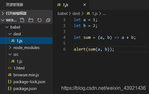 我们在 src 下面创建一个使用 ES6 语法的 1.js 文件,并编译: