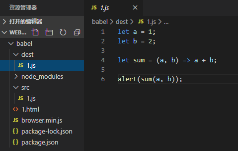然后,我们就看到有一个新的目录 dest 被创建了,这里面放的就是 babel 编译之后的文件。