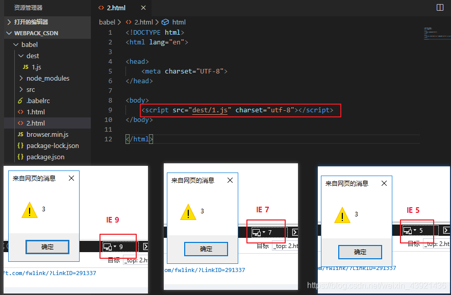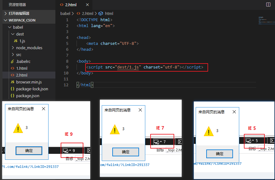 然后我们引入编译后的 js 文件,再重新放到 IE 浏览器中的各个版本中运行,可以看到,都能正常运行。