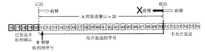 发送窗口后沿的变化有两种情况:不动(没有收到新的确认)和前移(收到了新的确认),发送窗口后沿不可能向后移动,因为不能撤销掉已收到的确认。