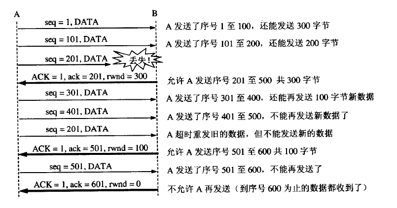 如:A向B发送数据,在连接建立时,B告诉A“我的接收窗口rwnd=400”,设每一个报文段为100字节长,数据报文段序号的初始值为1,则有: