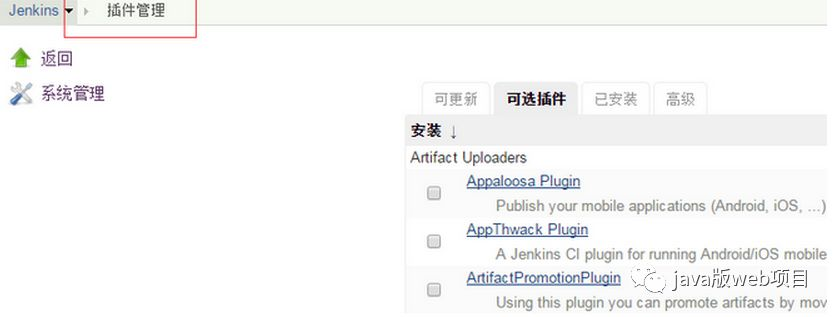 首页->系统管理->管理插件->可选插件->过滤(搜索插件名)->勾选->点击最下面直接安装即可(需要等待一段时间,详情可以看catalina.out日志变化)