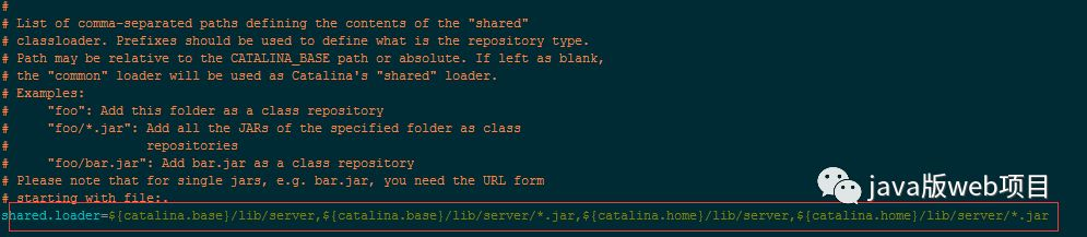 shared.loader=${catalina.base}/lib/server,${catalina.base}/lib/server/*.jar,${catalina.home}/lib/server,${catalina.home}/lib/server/*.jar