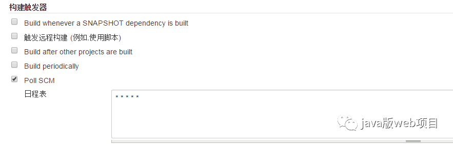 这里我们选择poll轮询每隔1分钟去检测git仓库代码库版本,如果有更改则立刻构建,这里大家可以根据自己团队实际情况去制定,当然还有另外一个插件gitlab-hook可以主动去通知jenkins构建,不过插件所占内存比较大,需要增大tomcat虚拟机内存配置,不然会内存溢出,个人觉得如果一个团队人很多的话,选择poll更适合并且时间间隔设置长一些,避免频繁构建,gitlab-hook 适合人很少甚至一个人的情况。