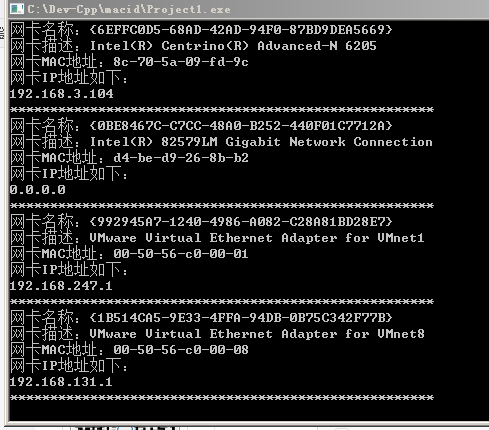 cout << "网卡描述:" << pIpAdapterInfo->Description << endl;
