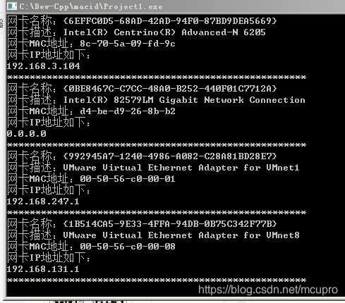 cout << "网卡名称:" << pIpAdapterInfo->AdapterName << endl;