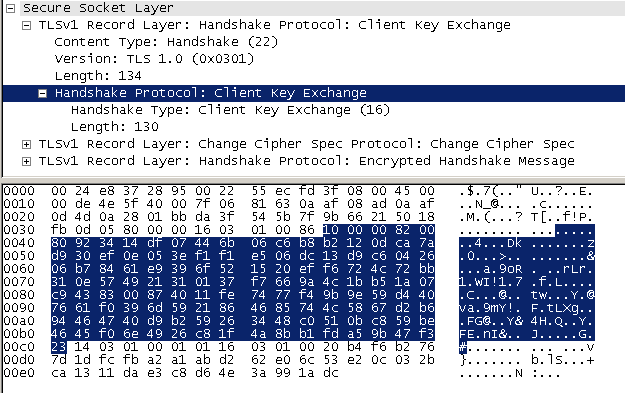client拿到server的certificate后,就可以开始利用certificate里的public key进行session key的交换了。从图中可以看出,client发送的是130字节的字节流,显然是加过密的。client随机生成48字节的Pre-master secret,padding后用public key加密就得到这130字节的数据发送给server,server解密也能得到Pre-master secret。双方使用pre-master secret, "master secret"常量字节流,前期交换的server端RN和client的RN作为参数,使用一个伪随机函数PRF,其实就是hash之后再hash,最后得到48字节的master secret。master secret再与"key expansion"常量,双方RN经过伪随机函数运算得到key_block,PRF伪随机函数可以可以仿佛循环输出数据,因此我们想得到多少字节都可以,就如Random伪随机函数,给它一个种子,后续用hash计算能得到无数个随机数,如果每次种子相同,得到的序列是一样的,但是这里的输入时48字节的master secret,2个28字节的RN和一个字符串常量,碰撞的可能性是很小的。得到key block后,算法,就从中取出session key,IV(对称算法中使用的初始化向量)等。client和server使用的session key是不一样的,但只要双方都知道对方使用的是什么就行了。这里会取出4个:client/server加密正文的key,client/server计算handshake数据hash的key。