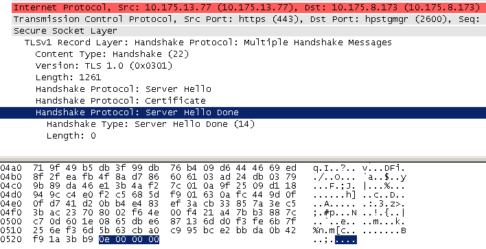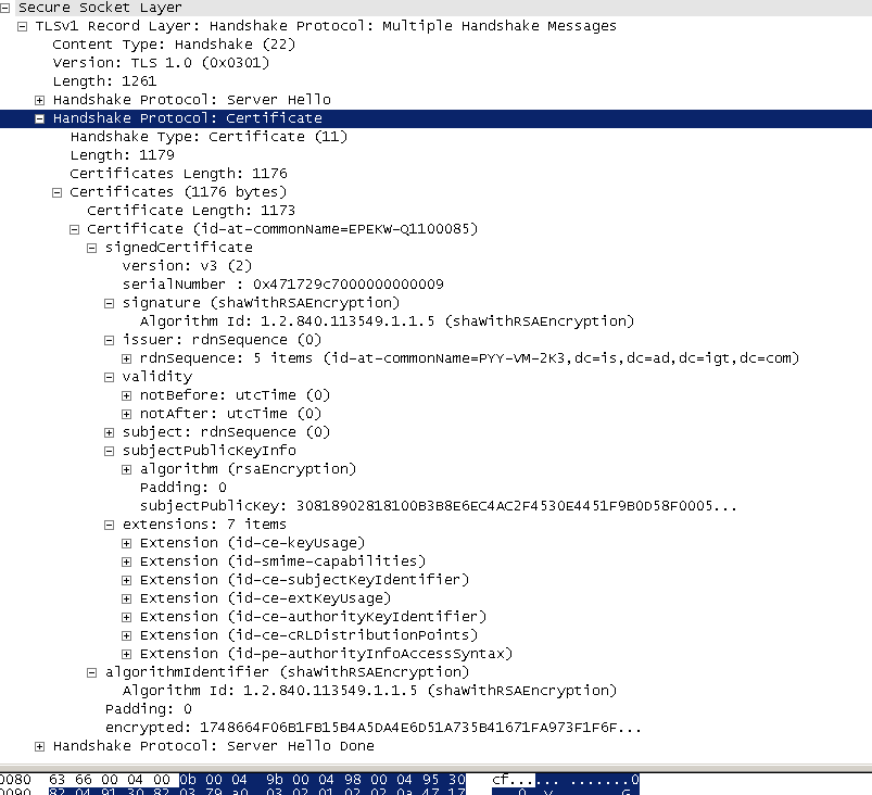 这次server共发送的3个handshake 消息:Serverhello,Certificate和ServerHelloDone,共用一个ContentType:Handshake