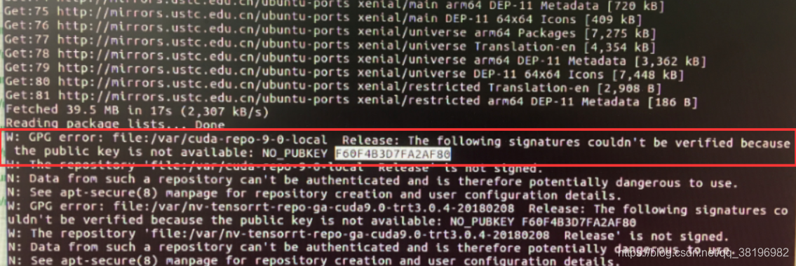 这是一个GPG错误,下列签名无法验证,我们需要获取系统中的这个公匙,从信息中获取密钥号,上面的错误密钥好是F60F4B3D7FA2AF80,终端输入