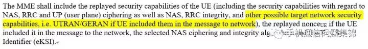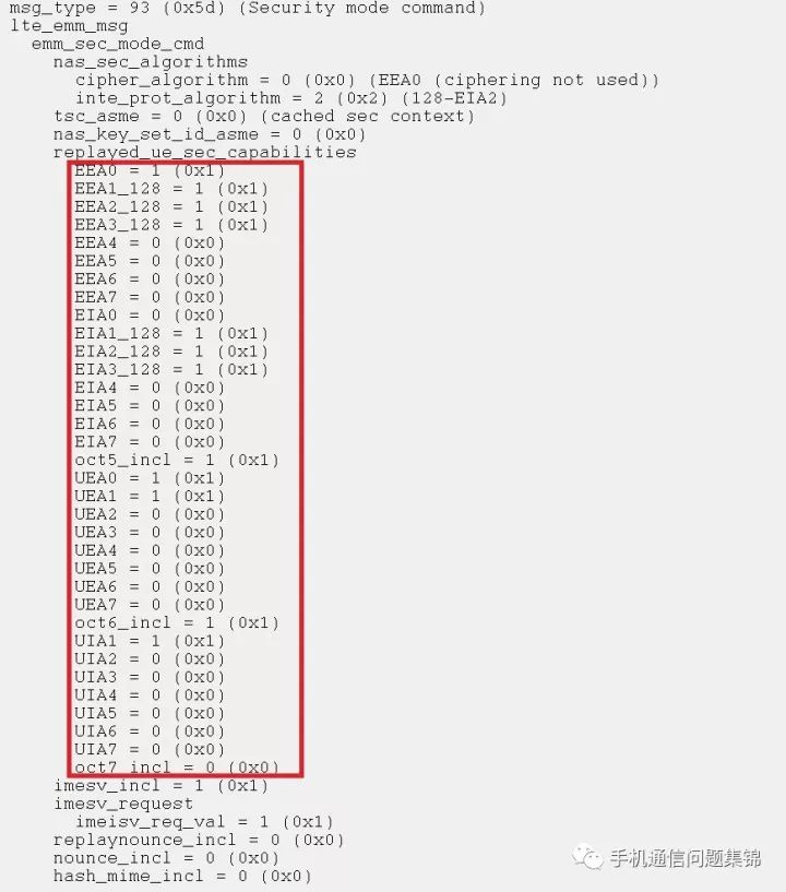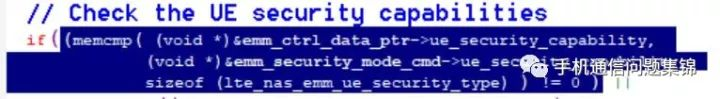 查阅了EMM的代码后发现就是简单的一句内存比较函数memcmp,比较手机本地缓存的安全能力和网络SMC过程带的replayed_ue_sec_capabilities IE。
