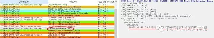 过滤完OTA日志后,很明显可以看出是UE回复了NAS SMC reject后导致Attach失败,NAS SMC Reject还携带了原因值UE security capability mismatch。通过这条线索,我们继续看看网络发给UE的NAS SMC都带了那些UE安全相关的能力,如下包含了EEA/EIA/UIA/UEA各算法的支持情况