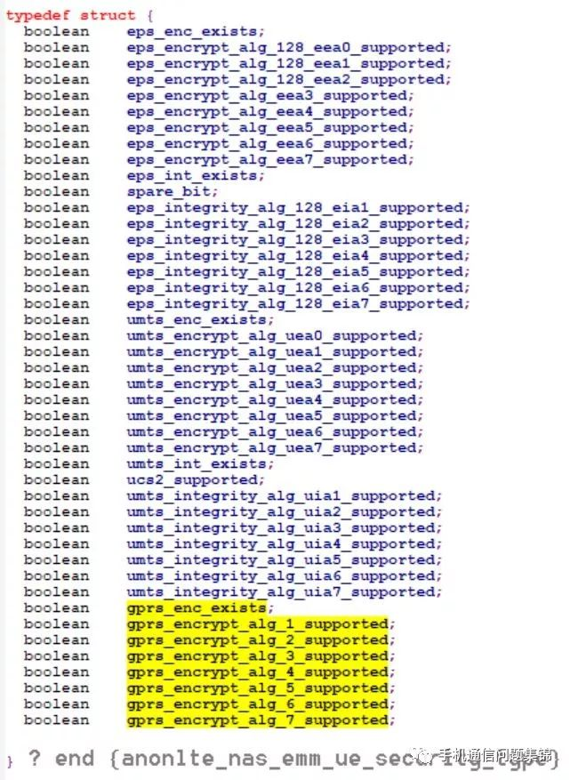 看了眼对应的结构体lte_nas_emm_ue_security_type后,果不其然导致UE security capabililty mismatch就是因为网络在SMC过程没有包含GEA算法相关IE,memcmp不为0。