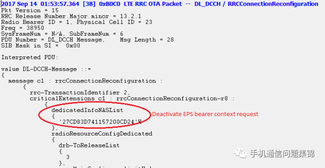 问题就出在无线侧eNB处异常,发送了异常RRC重配,正常情况下的eNB会下发不仅包含DRB释放还会包含NAS信令(即Deactivate EPS bearer context request)的RRC重配消息,如下: