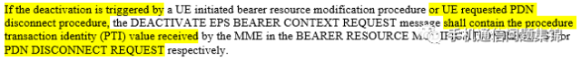 读者朋友们可以连读我标黄的句子,大体意思就是如果deactivation是由于UE要求PDN连接释放过程引起,MME应该在Deactivate EPS bearer context request 里设置PTI为其在UE发给它的PDN Disconnect request里收到的一致。