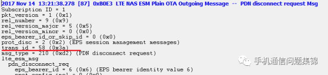 调查方向一转,查看了UE发给MME的PDN disconnect request里PTI就是等于58。MME行为正确!