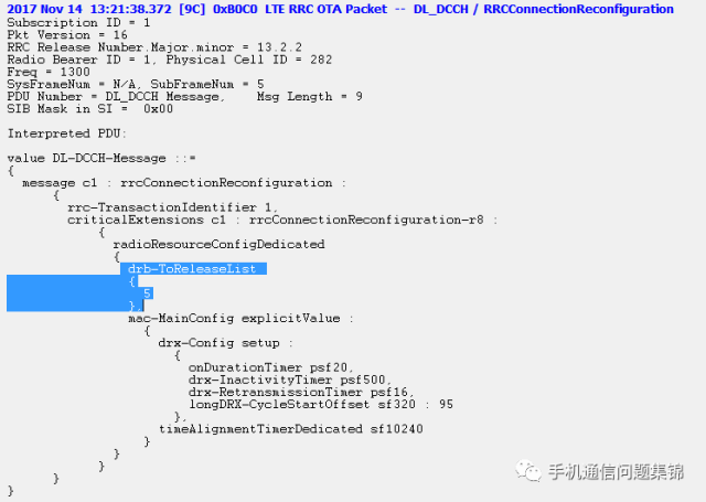 MSG 13:21:38.372 LTE RRC/High [ lte_rrc_llcdb.c 5220] PDCP DL: rb_cfg_idx 5 being released