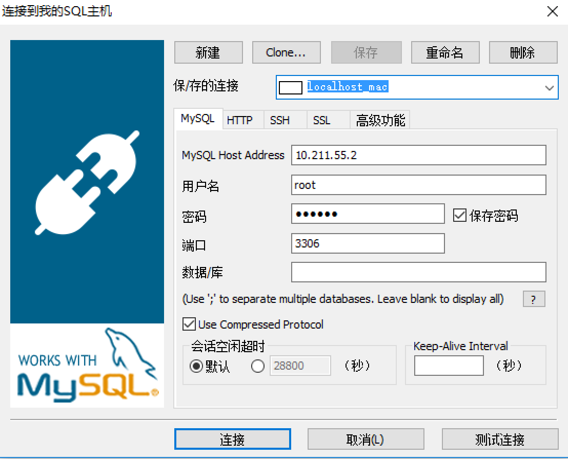 这样我在mac主机上装的mysql数据库也可以在win10中进行访问了。