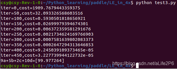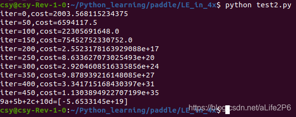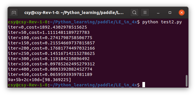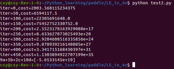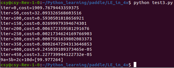PaddlePaddle官网上有一个简单的线性回归模型的例子,粘贴如下内容到新建的test.py中: