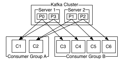 这里有2个组AB在消费数据。在组1中,P0P3被C1消费,P1P2被C2消费,而在组B中,P0P3P1P2分别被C3C4C5C6消费。需要注意的是,消费者过多,可能导致部分消费者被闲置,如下所示