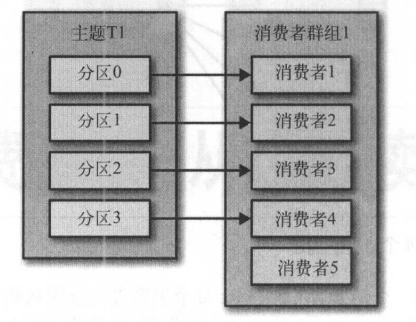 这里因为一个分区只能被一个消费者消费,所以消费者5因为没有分配到分区,被闲置