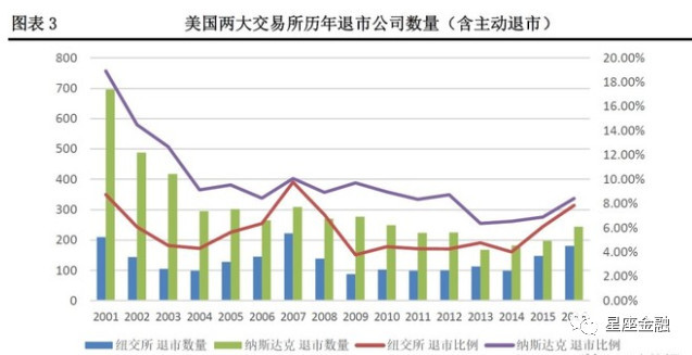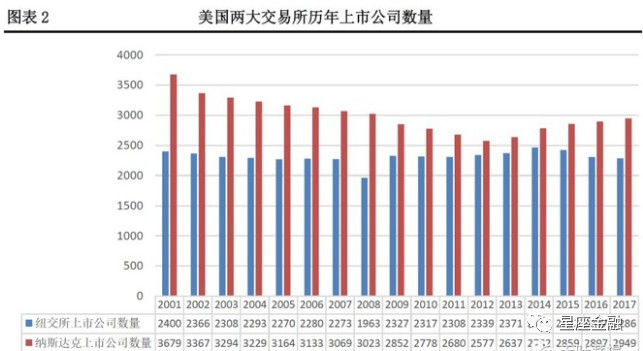 美国从2001年以来,基本保持,纽交所上市公司数量在2300支左右,纳斯达克上市公司数量在3000支左右。