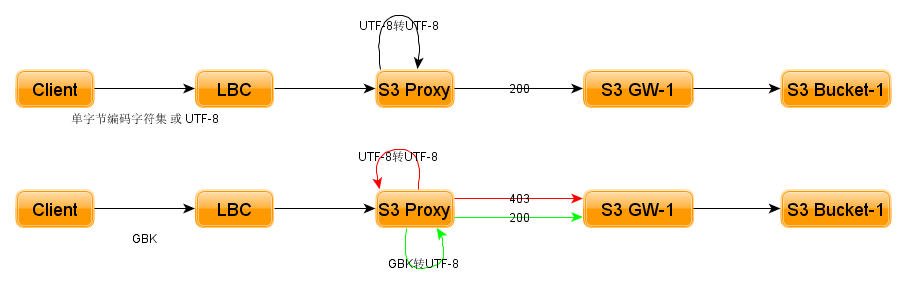 大致的思路是,服务端作适配,将 Client 的 GBK 编码的请求,在转发到 S3 Bucket 前,将请求的 URI 转为 UTF-8 编码,