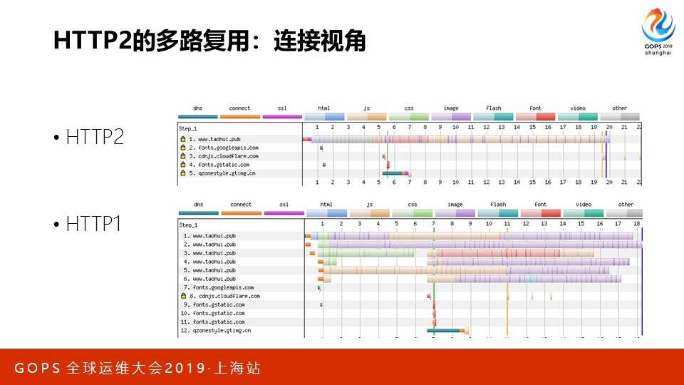HTTP2的stream就是这样复用连接的。我们知道,chrome对一个站点最多同时建立6个连接,而有了HTTP2后,只需要一个连接就能高效的传输页面上的数百个对象。我特意让我的个人站点www.taohui.pub同时支持HTTP1和HTTP2,下图是连接视角上HTTP2和HTTP1的区别。