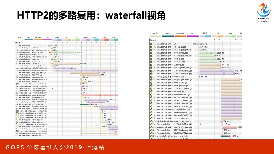 熟悉chrome Network网络面板的同学,肯定很熟悉waterfall,它可以帮助你分析HTTP请求到底慢在哪里,是请求发出的慢,还是响应接收的慢,又或者是解析得太慢了。下图还是我的站点在waterfall视角下的对比。