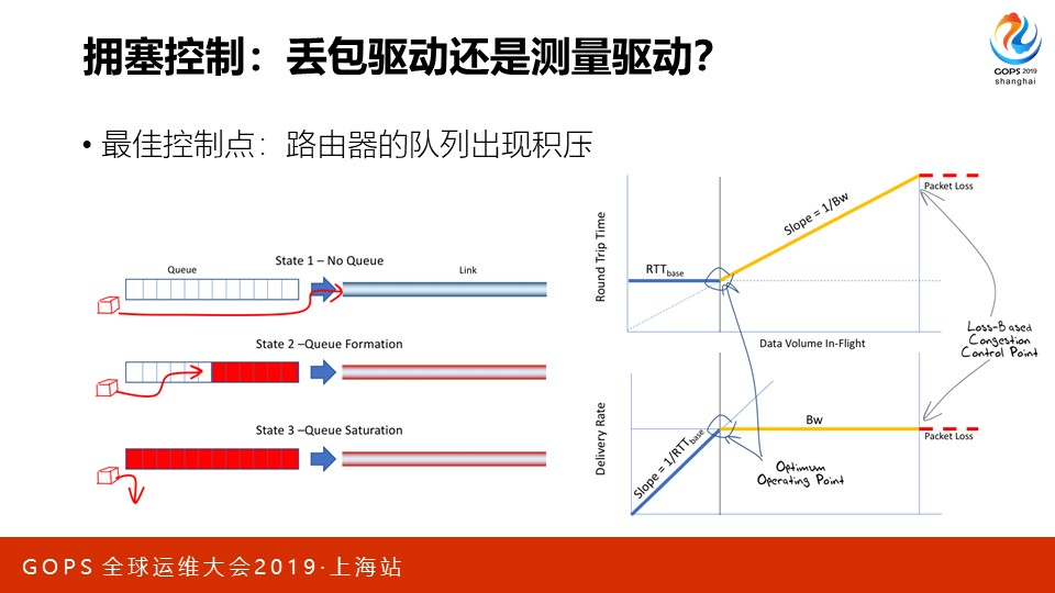 所以,当队列出现积压时,丢包没有发生。虽然此时峰值带宽不会减少,但网络时延变大了,这是要避免的。而测量驱动的拥塞控制算法,就在队列刚出现积压这个点上开始刹车减速。在当今内存越来越便宜,队列越来越大的年代,新算法尤为有效。
