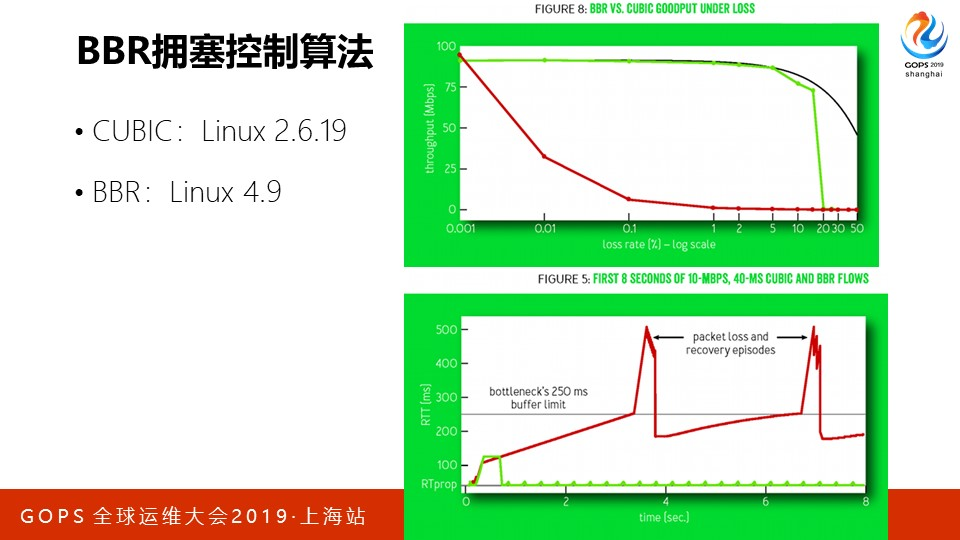 当Linux内核更新到4.9版本时,原先的CUBIC拥塞控制算法就被替换为Google的BBR算法了。从下图中可以看到,当丢包率达到0.01%时,CUBIC就没法用了,而BBR并没有问题,直到丢包率达到5%时BBR的带宽才剧烈下降。