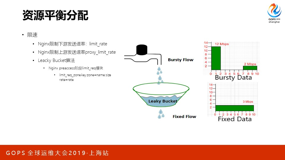 再来看资源的平衡分配。为了公平的对待连接、用户,服务器会做限速。比如下图中的Leacky Bucket算法,它能够平滑突增的流量,更公平的分配带宽。