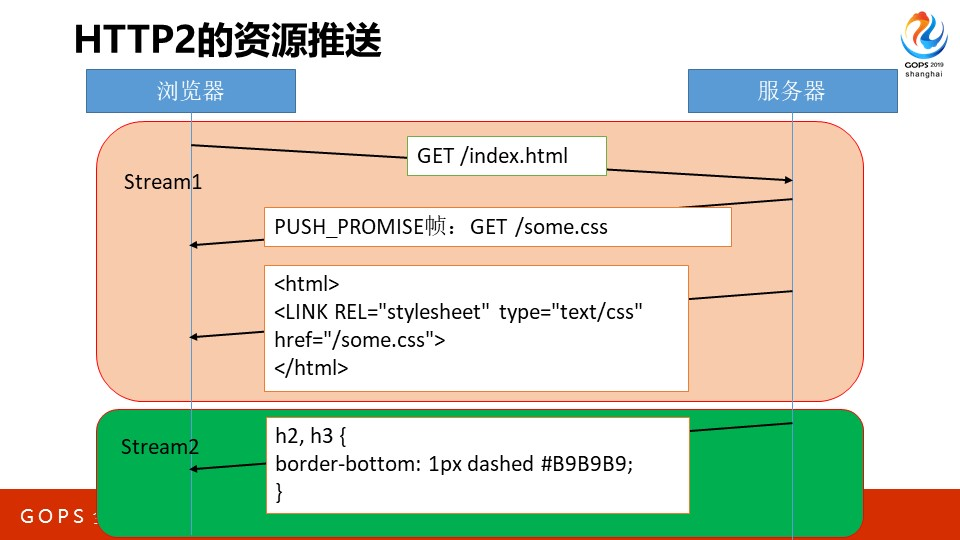 再来看传输路径上,如何从拉模式升级到推模式。比如index.html文件中包含<LINK href=”some.css”>,在HTTP/1中,必须先下载完index.html,才能去下载some.css,这是两个RTT的时间。但在HTTP/2中,服务器可以通过2个stream,同时并行传送index.html和some.css,节约了一半的时间。