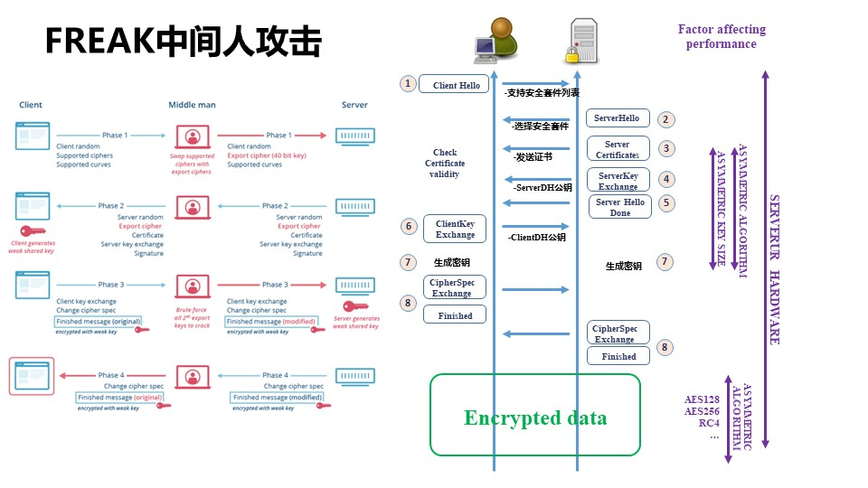 TLS1.2有什么问题呢?最大问题就是,它支持古老的密钥协商协议,这些协议现在已经不安全了。比如2015年出现的FREAK中间人攻击,就可以用Amazon上的虚拟机,分分钟攻陷支持老算法的服务器。