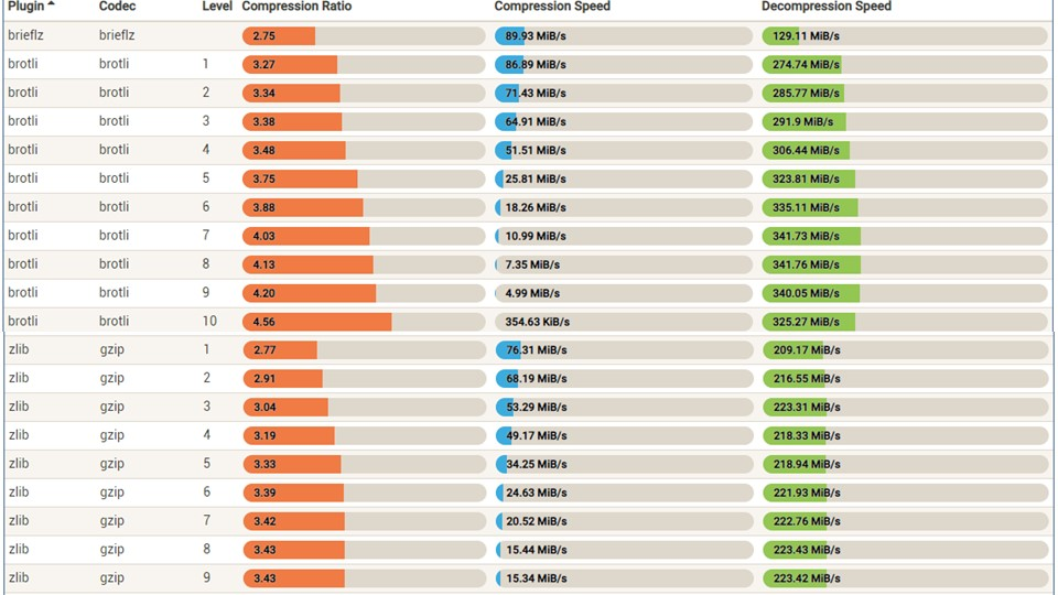 再来看无损压缩,你肯定用过gzip,它让http body实现了无损压缩。肉眼阅读压缩后的报文全是乱码,但接收端解压后,可以看到发送端的原文。然而,gzip的效率其实并不高,以Google推出的brotli做对比,你就知道它的缺陷了: