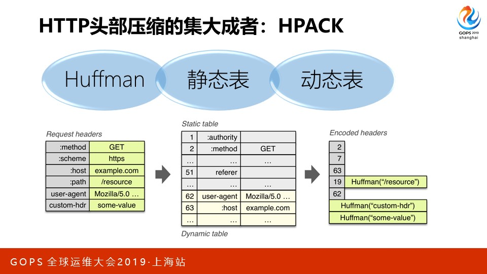 HPACK通过Huffman算法、静态表、动态表对三种header都做了压缩。比如上图中,method GET存在于静态表,用1个字节表示的整数2表达即可;user-agent Mozilla这行头部非常长,当它第2次出现时,用2个字节的整数62表示即可;即使它第1次出现时,也可以用Huffman算法压缩Mozilla这段很长的浏览器标识符,可以获得最多5/8的压缩率。