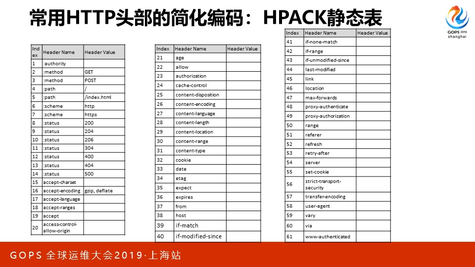 静态表中只存放最常见的header,有的只有name,有的同时包括name和value。静态表的大小很有限,目前只有61个元素。