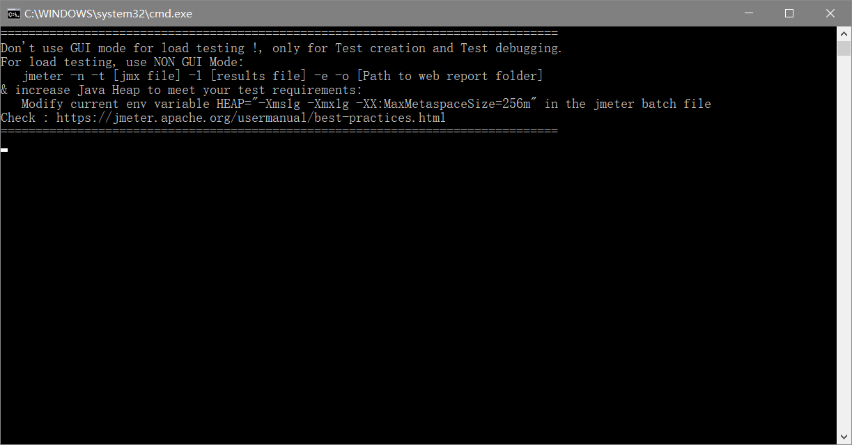 上面的意思就是:不要使用GUI运行压力测试,GUI仅用于压力测试的创建和调试;执行压力测试请不要使用GUI。使用下面的命令来执行测试:
