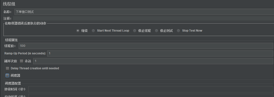 设置线程数和循环次数。我这里设置线程数为500,循环一次。