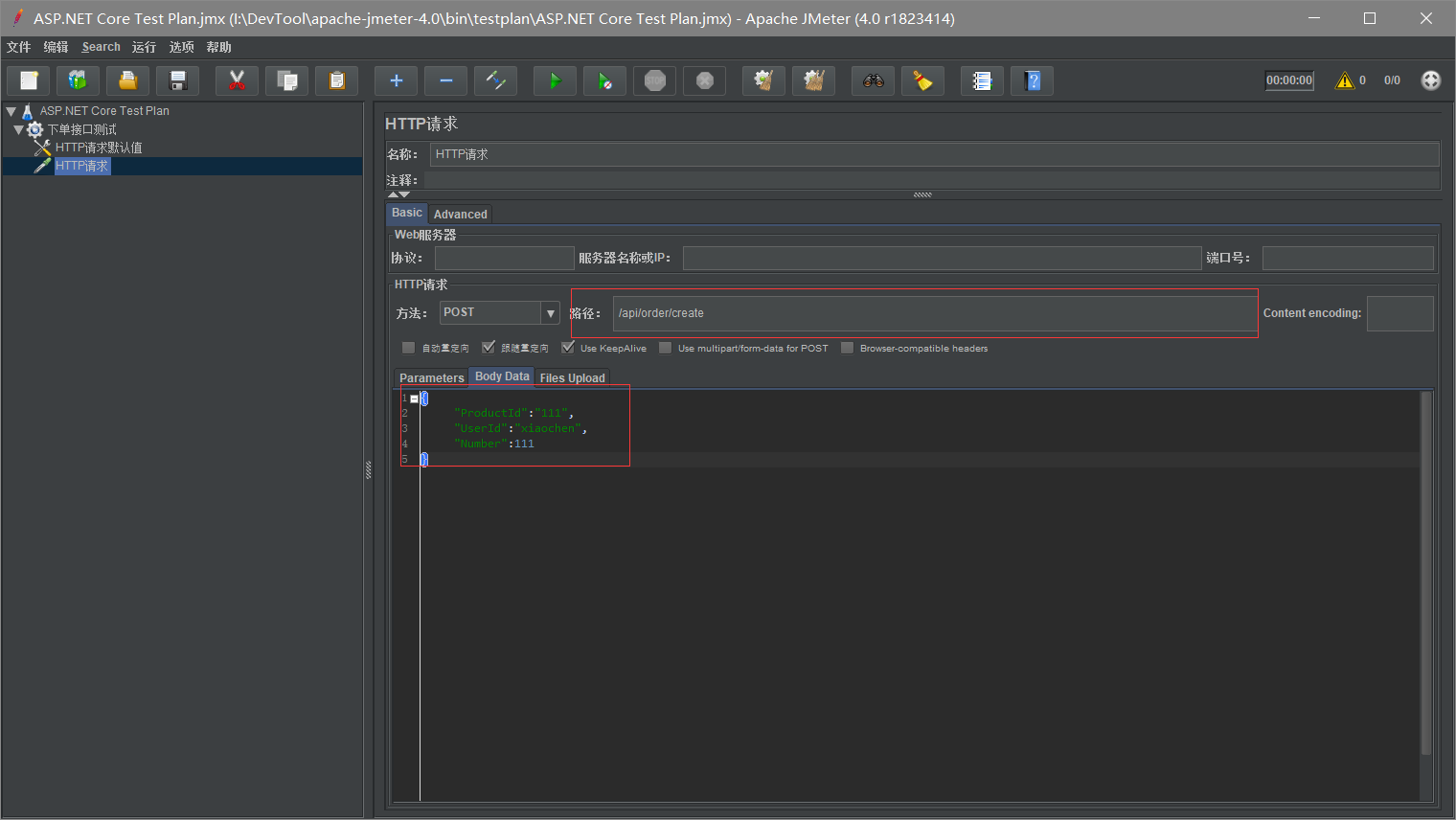 在“线程组”右键 【添加-】->【samlper】-->【HTTP 请求】设置我们需要测试的API的请求路径和数据。我这里是用的json
