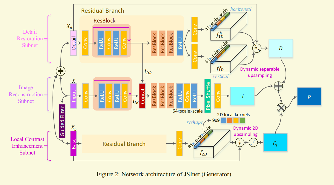 •JSI-GAN的设计旨在具有特定于任务的子网(DR / IR / LCE子网络),这些子网具有像素级的1D可分离滤波器以改善局部细节,并具有2D局部滤波器以增强局部对比度,方法是考虑给定放大系数的局部上采样操作。