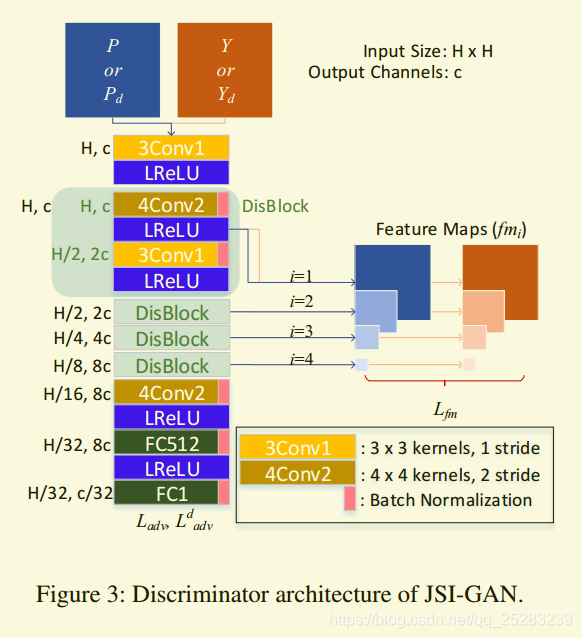 其中, BN表示 batch normalization, LRL 表示 Leaky ReLU激活slope size 为0.2, FCk 表示全连接层有k个输出通道. K Conv s表示k*k 大小的 kernel size , stride 为s