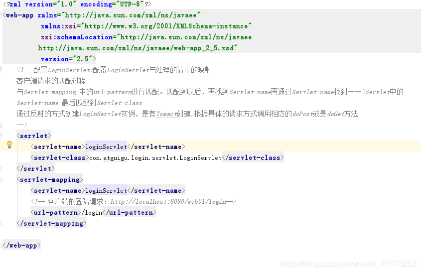 对上面配置文件信息,在这里做出相应的解析。首选这是一个xml文件,xml的初衷是要干掉html,最后没有干掉所有就没有相应的版本更新一直未为1.0版,成为了一个配置信息的文件。<servlet></servlet>这对标签是给Tomcat配置Servlet程序,<servlet-name><servlet-name>是给Servlet程序起的一个别名(一般在行业里规定是类名)<servlet-class></servlet-class>中填写是Servlet程序的全类名,是Tomcat通过反射的方式,现实对后台的操作。<servlet-mapping></servlet-mapping>是给<servlet></servlet>标签元素来了个映射,使得它下面的两个标签元素<servlet-name><servlet-name>(和上面的一样填写类名)和<url-pattern></url-pattern>(/填写相应的文件名,斜杆相当于http://ip:端口号/工程路径),得到相应的映射。客户端通过访问,被<url-pattern>接受、然后通过一个<servlet-name>和映射来访问到<servlet-class>,最后访问到后台。