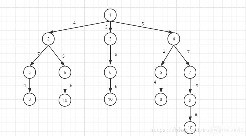 1)节点1入队列,Q={1}。我们取出队头节点,作为扩散节点,更新他的后代的值。此题中更新节点2,3,4 的距离,并将他们加入队列,Q={1,2,3,4}。 完成后节点1出队。Q={2,3,4}。