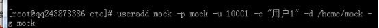 useradd mock -p mock -u 10001 -c "用户1" -d /home/mock -g mock