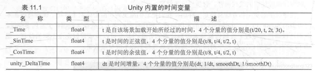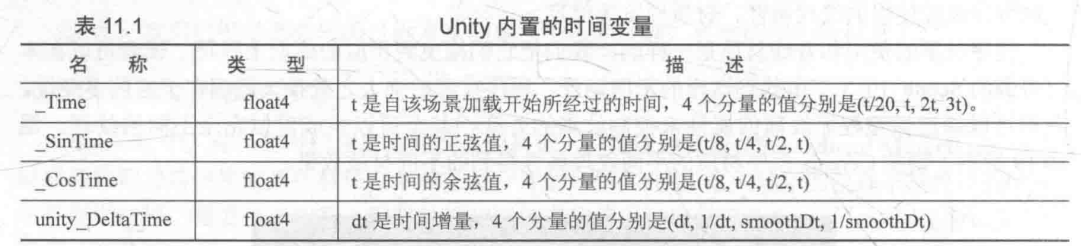 //首先进行顶点变换,把顶点从模型空间变换到裁剪空间中。然后,我们计算两层纹理背景的纹理坐标。为此,我们首先利用TRANSFORM_TRANSFORM_TEX来得到初始的纹理坐标。然后,利用_Time.y变量在水平方向对纹理坐标进行偏移,我们吧两张纹理坐标存储在同一个变量o.uv中,以减少占用的插值寄存器空间。