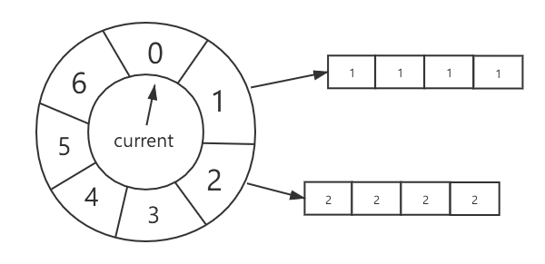 每次取任务时总是从current指针指向的槽位的队列读取任务。当一定时间流逝后,current指针沿着右侧移动一位,此时意味着所有槽位的优先级都被晋升了,除了原本的current指向的槽位,它变为了最低优先级槽位。