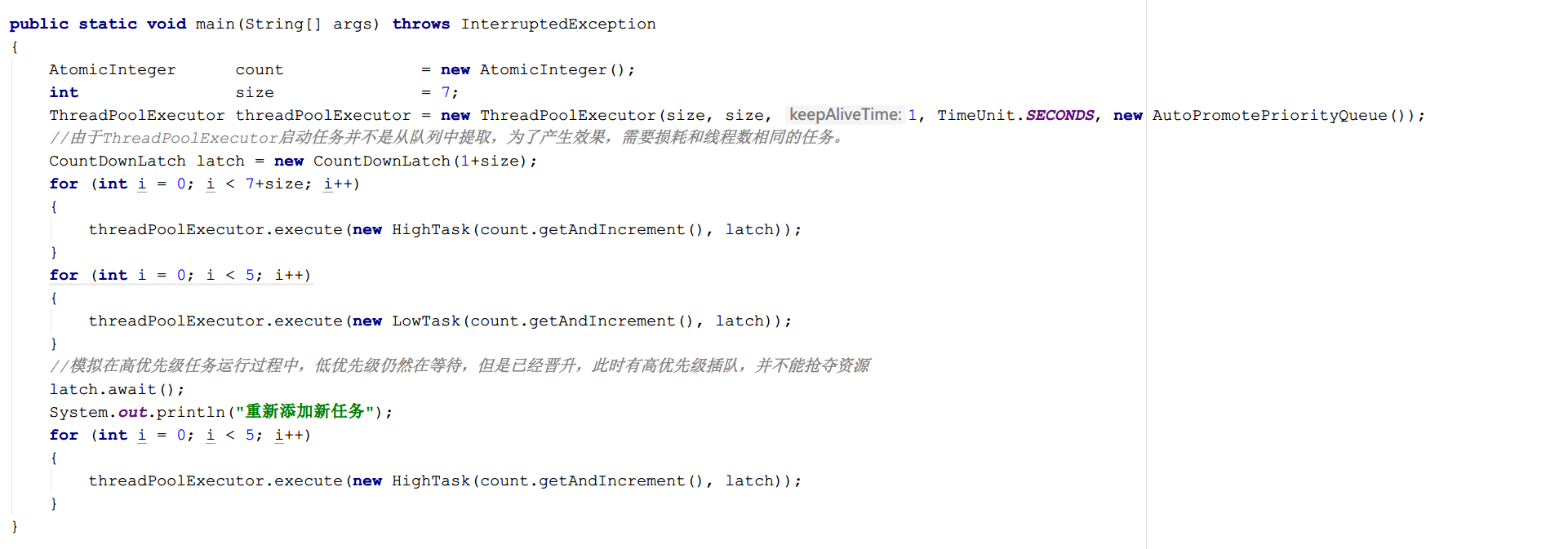 首先添加一定量的高优先级任务,随后添加5个低优先级,最后通过CountLatch模拟在运行过程中添加高优先级任务。